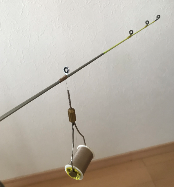ガイドに十分な糸を巻いてしっかり固定したら、糸の終端を処理します。最後に接着剤で糸を固めてしまいますので、糸の終端はほつれない程度に固定出来ていればよいと思いますが、私は2・3回程度ハーフヒッチして終了としてます。(ハーフヒッチはフライタイイングで多用する手法ですが、詳しくはGoogle先生まで)